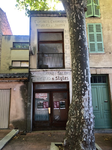 Een echt Frans dorp dat ooit vol leven was. Restaurants, winkeltjes, ontmoetingsplekken, drukte. Maar de wereld verandert. Toeristen willen meer luxe, meer winkels bij elkaar met een breed assortiment. En ook de lokale bewoners kopen liever bij de Ecomarché omdat dat voordelig is. Alle crises hebben hier flink toegeslagen. Het inkomen is laag en iedere euro is er een. Dus ook de salle à manger op de foto is reeds lang gesloten. Het grootste hotel, het enige hotel van het dorp is dicht. Het wordt nu verbouwd en de gevel doet vermoeden dat er weer groots gelogeerd kan worden op termijn.