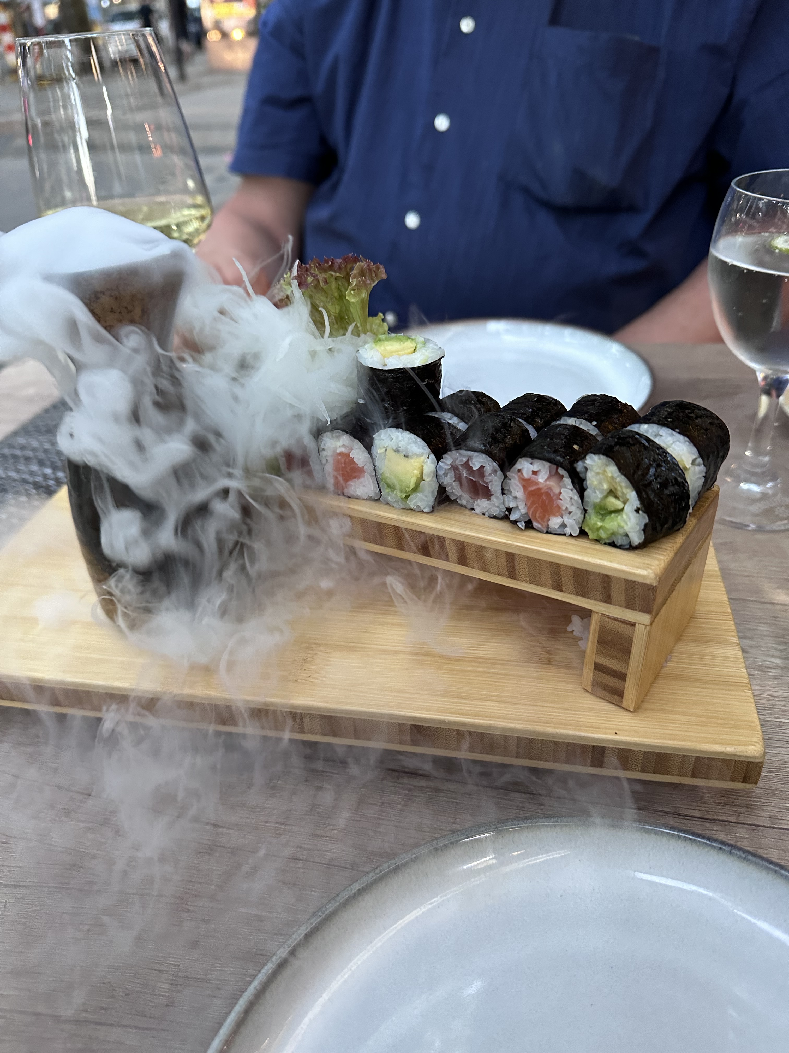 Wij bestellen en hij at van de sushi die hij altijd bestelt: met komkommer en met tonijn.